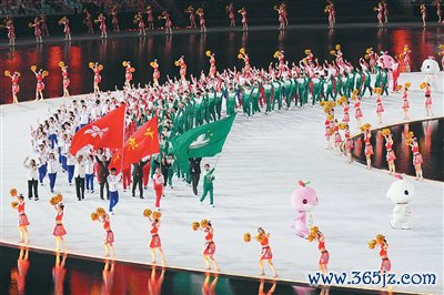 11月9日,第十五届天下通顺会开幕式在广东奥林匹克体育中心举行。图为广东省体育代表团、香港十分行政区体育代表团和澳门十分行政区体育代表团在入场典礼上共同入场。 新华社记者 薛宇舸摄